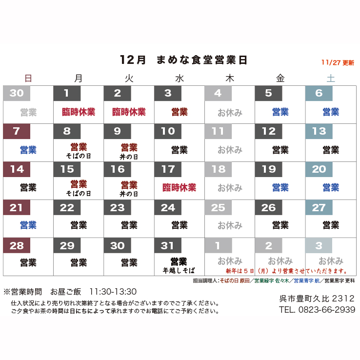※毎週木曜日の定休のほか12月1日,2日,17日は臨時休業とさせていただきます。