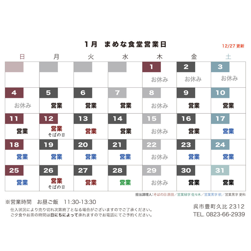 1月の営業カレンダー